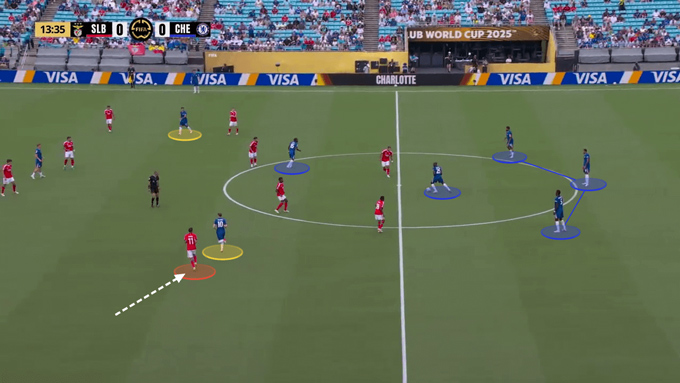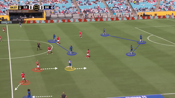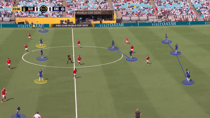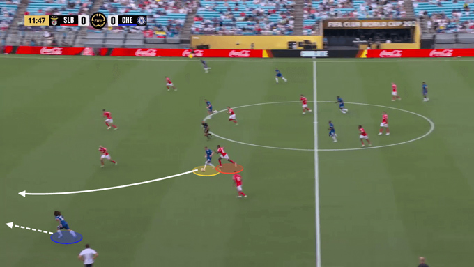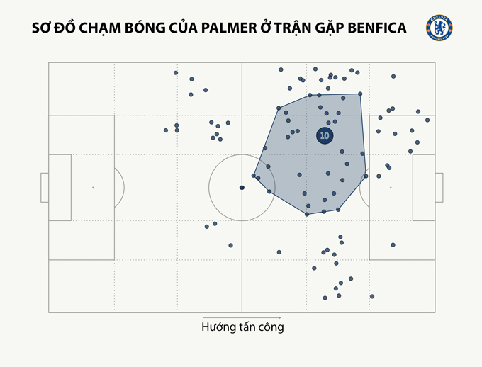 Trước Benfica, Palmer hoạt động chủ yếu trong nửa không gian trái (half-space), nhường đường biên cho Cucurella dâng cao đá sát khung thành.