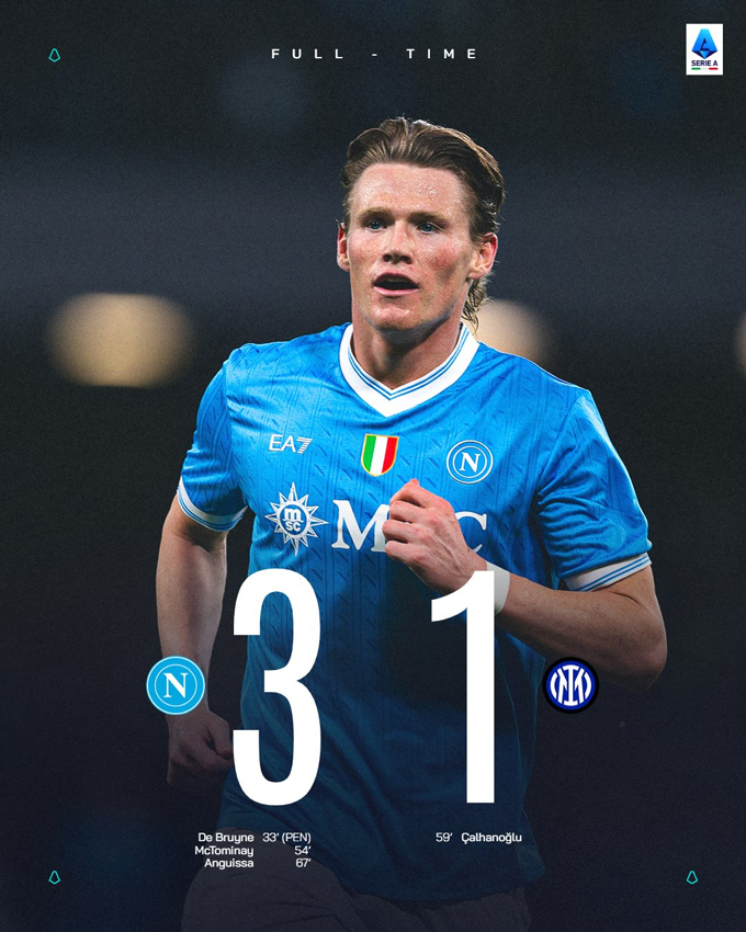 Phút 59, Hakan Calhanoglu rút ngắn cách biệt cho Inter trên chấm phạt đền sau khi Buongiorno để bóng chạm tay trong vòng cấm. Tuy nhiên, chỉ 7 phút sau, Anguissa đã chấm dứt mọi hy vọng của Nerazzurri với pha dứt điểm quyết đoán để ấn định tỷ số 3-1 cho Napoli.