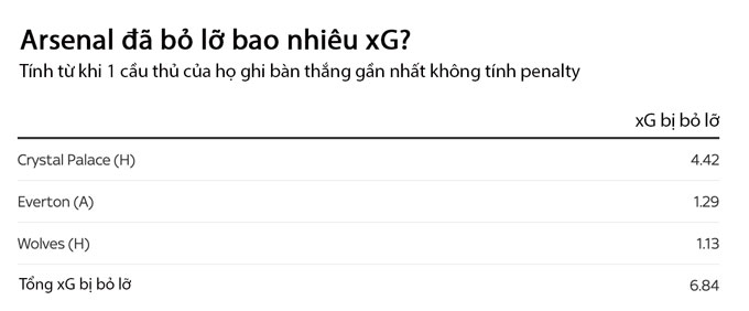 Bàn phản lưới hay penalty không phải điều đáng xấu hổ, chúng cho thấy Arsenal tạo đủ sức ép để khiến đối thủ mắc sai lầm. Nhưng dữ liệu chỉ ra rằng trong 3 trận gần nhất, các cầu thủ Arsenal lẽ ra phải ghi ít nhất 6 bàn, song lại không thể làm được.