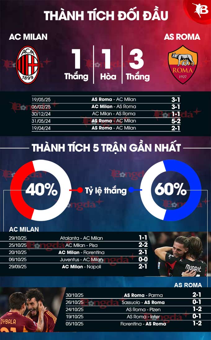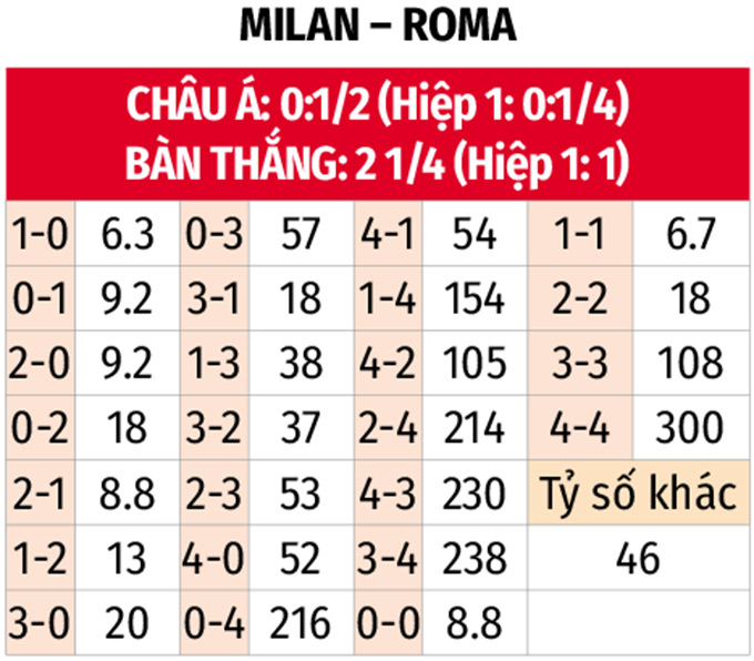 - AS Roma thắng châu Á: Các cầu thủ AC Milan chỉ thắng châu Á 1/4 trận đấu gần đây. Thành tích này hoàn toàn trái ngược AS Roma, đội chơi rất bùng nổ ở những chuyến làm khách khi thắng châu Á 9 trận liên tiếp trên mọi đấu trường.