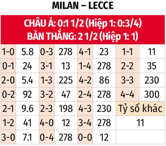 - Milan thắng châu Á: Những màn trình diễn gần đây trên sân nhà của Milan trước các đội bóng xếp hạng thấp hơn, kết hợp với khả năng phòng ngự kém cỏi của Lecce cho thấy một chiến thắng cách biệt nhiều bàn là hoàn toàn khả thi.