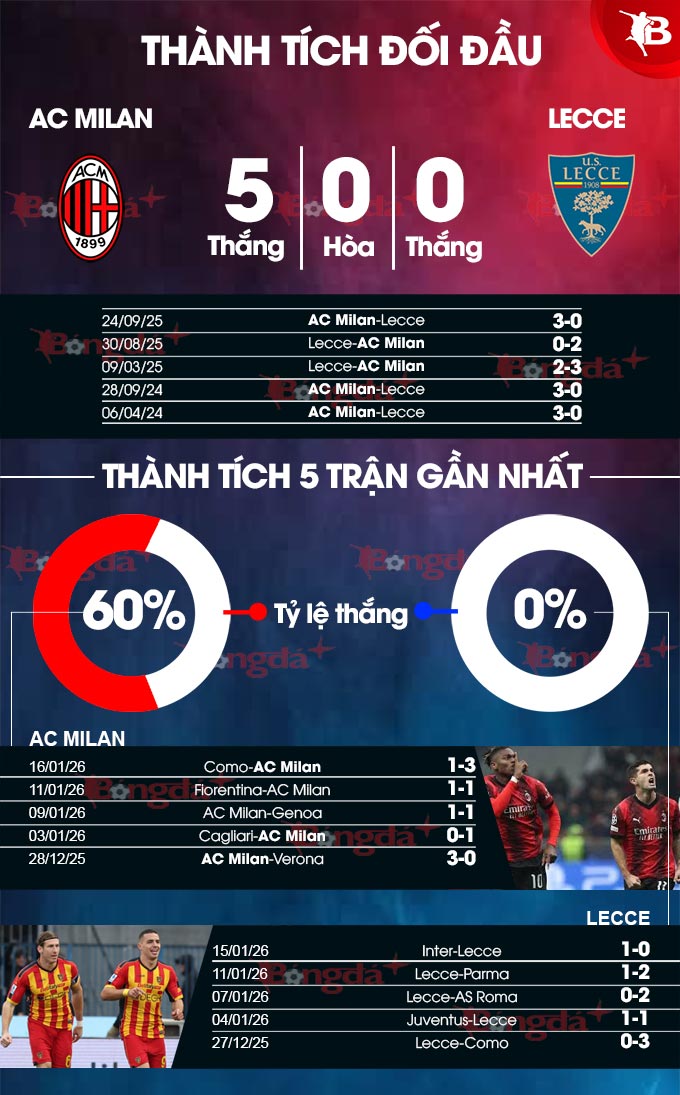 Trước một Lecce đang trải qua giai đoạn sa sút thảm hại, AC Milan với ưu thế được chơi trên sân nhà và quyết tâm cạnh tranh ngôi đầu nhiều khả năng sẽ có một chiến thắng dễ dàng.