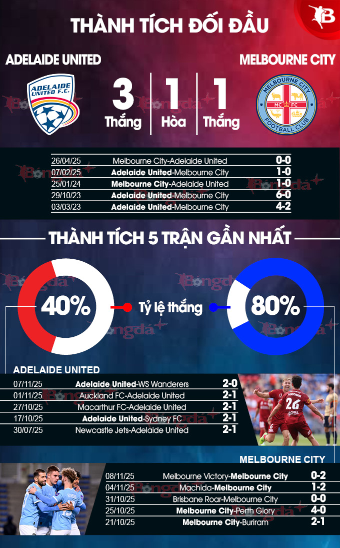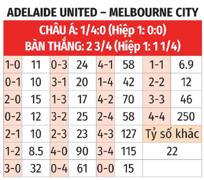 - Hiệp 1 có bàn thắng: 4/6 trận gần đây của Melbourne City cùng 5/7 trận vừa qua của Adelaide United đều có bàn thắng trong 45 phút đầu tiên. 4/6 trận đối đầu gần nhất cũng xuất hiện bàn thắng trước giờ nghỉ.