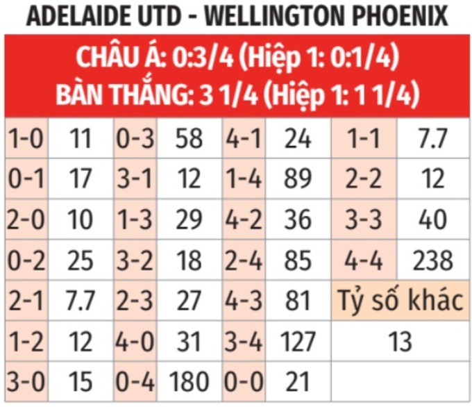 - Tối thiểu 2 bàn hiệp 1: 3/4 lần đối đầu giữa 2 đội gần đây có từ 2 bàn thắng trở lên trong hiệp 1. 3 trận gần đây của Adelaide United và 3/4 trận vừa qua của Wellington Phoenix tương tự.