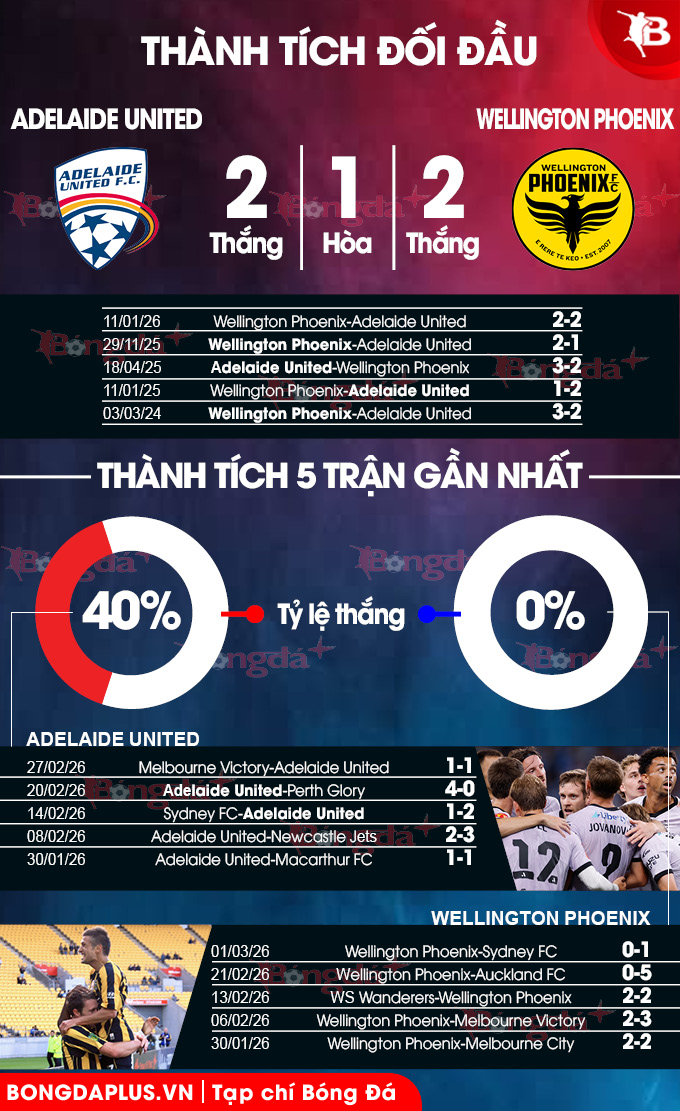 Adelaide United thắng 2, hòa 1 ở 3 trận đấu gần đây. Họ đang xếp thứ 4 tại bảng xếp hạng, hơn Wellington Phoenix 8 bậc.