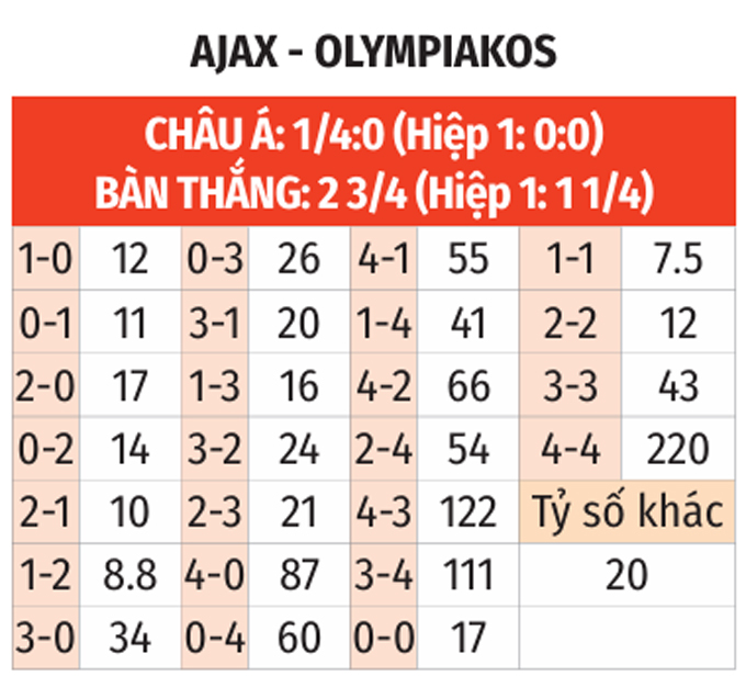 - Chẵn bàn thắng: 7/10 trận gần nhất của Ajax có tổng bàn thắng chia hết cho 2. Ngoài ra, 7/8 trận vừa xong của Olympiakos chứng kiến điều tương tự.