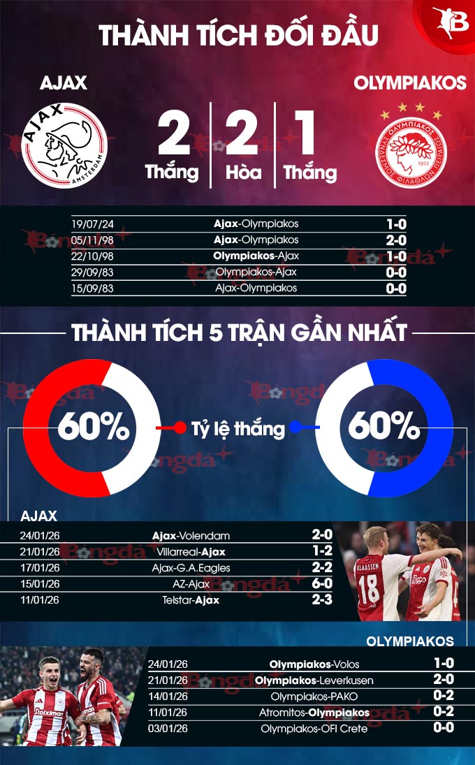 Vì thế, Ajax cũng đừng hi vọng sẽ có trận đấu dễ dàng trên sân nhà. Vào lúc này, Ajax đang có phong độ cao tại thánh địa của mình với mạch 5 trận bất bại (4 thắng và 1 hòa). Nhưng Olympiakos thậm chí còn nhỉnh hơn khi có mạch 6 trận liền không thua (thắng 5, hòa 1). Có khả năng, Ajax và Olympiakos sẽ chia điểm ở trận đấu "sinh tử" này.