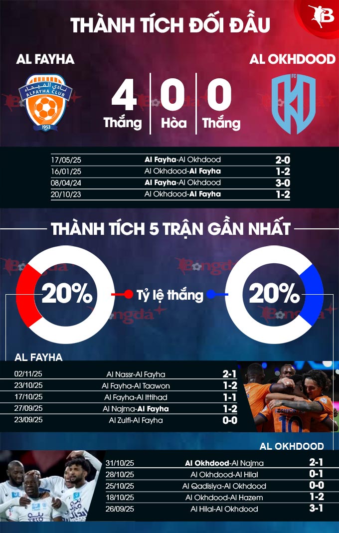 Đội chủ nhà đã thắng cả 4 lần gặp nhau gần nhất, chỉ để thủng lưới 2 bàn. Cấu trúc đội hình và khả năng kiểm soát tỷ số sít sao nhiều khả năng sẽ giúp họ có lợi thế trước Al-Okhdood, đội đang gặp khó khăn trong việc kiểm soát bóng ở những trận đấu trên sân khách.