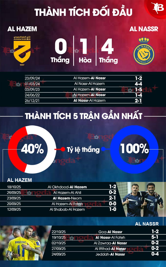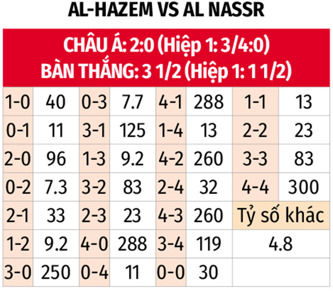 - Al Nassr thắng châu Á hiệp 1: Các cầu thủ Al Nassr nhập cuộc rất chủ động, giành chiến thắng 6/7 trận đấu gần đây ngay trong 45 phút đầu tiên. Lịch sử cũng chứng kiến Al Nassr sớm đánh bại Al Hazem ngay trước giờ nghỉ ở 5 trận gặp nhau gần nhất.