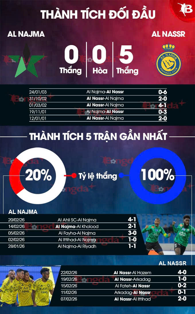 - Tối đa 3 bàn thắng: 4/5 trận gần đây của Al Najma đều kết thúc với tối đa 3 bàn thắng được ghi. Với Al Nassr, hàng thủ đội khách có mạch 8 trận liên tiếp sạch lưới và 7 trận trong số đó có nhiều nhất 3 pha làm bàn.
