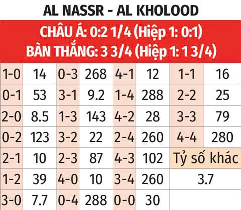 - Ít nhất 2 bàn hiệp 1: Các trận đấu của Al Nassr đang có xu hướng bùng nổ bàn thắng sớm, khi 7/8 trận gần đây đều kết thúc hiệp đầu với ít nhất 2 bàn thắng được ghi. Trận vừa qua của Al Kholood cùng 2 trận đối đầu trong quá khứ cũng có tối thiểu 2 bàn trước giờ nghỉ.