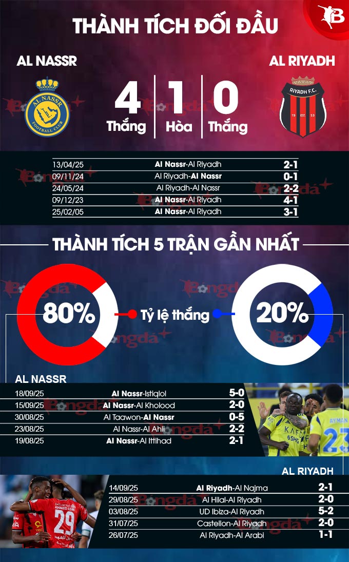 Trong khi đó, Al Riyadh đứng giữa bảng xếp hạng sau khi giành được 3 điểm từ 2 trận mở màn. HLV Javier Calleja, người thay thế Sabri Lamouchi vào tháng 7 sau chuỗi phong độ kém cỏi, vẫn đang nỗ lực xây dựng một đội bóng giàu sức chiến đấu. Tuy nhiên, thành tích của họ là chưa thể mang tới sự yên tâm dành cho NHM. Chưa kể, lịch sử cũng không ủng hộ Al Riyadh, khi Al Nassr đã thắng 7 trong 10 lần gặp nhau gần nhất giữa hai đội tại Saudi Pro League, chỉ để thua 2 lần kể từ năm 2004.