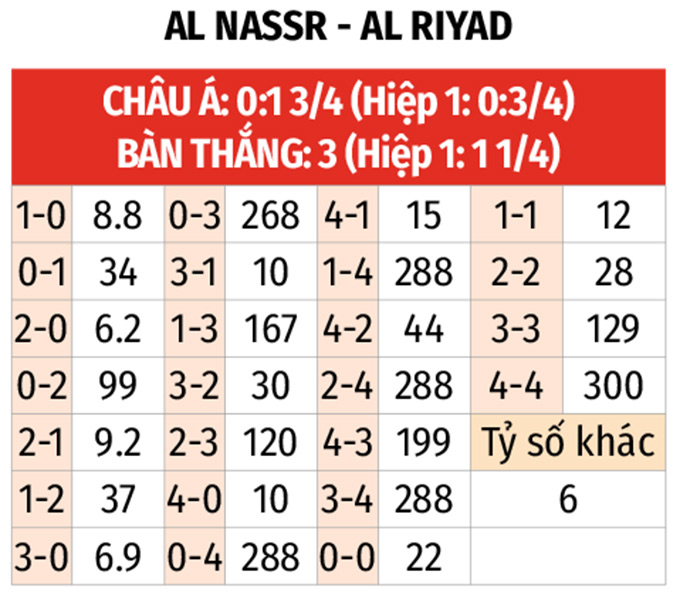 - Hiệp 1 có từ 1 bàn trở lên: 8/10 trận gần đây của Al Nassr cùng 5 trận liên tiếp vừa qua của Al Riyadh đều có ít nhất 2 bàn thắng trong 45 phút đầu tiên. Lịch sử đối đầu cũng chứng kiến 5 trận gặp nhau trong quá khứ có tối thiểu 1 bàn trước giờ nghỉ.
