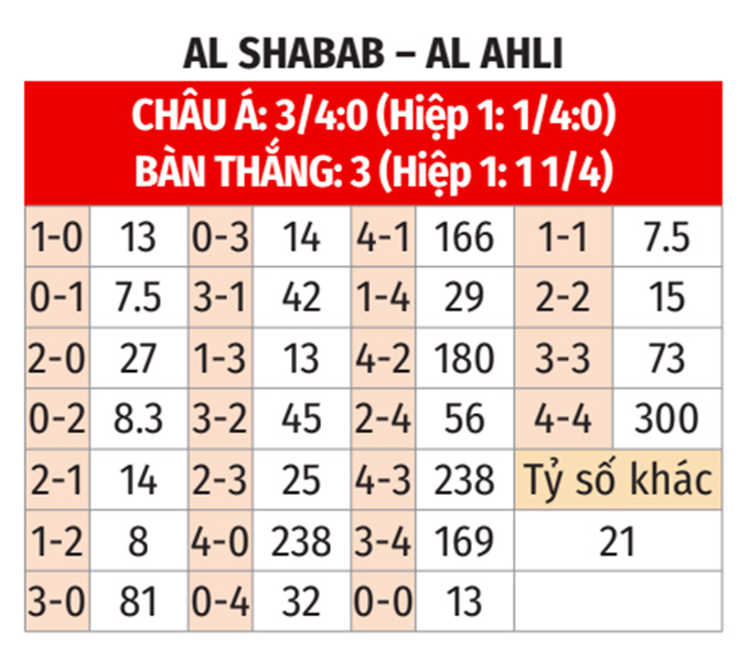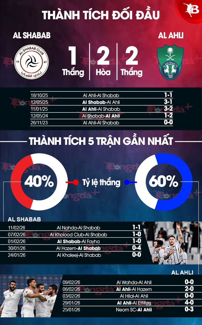 - Dưới 3 bàn cả trận: 4/5 trận gần nhất của Al Shabab và cả 3 trận gần đây của Al Ahli đều có dưới 3 lần lưới rung cả trận.