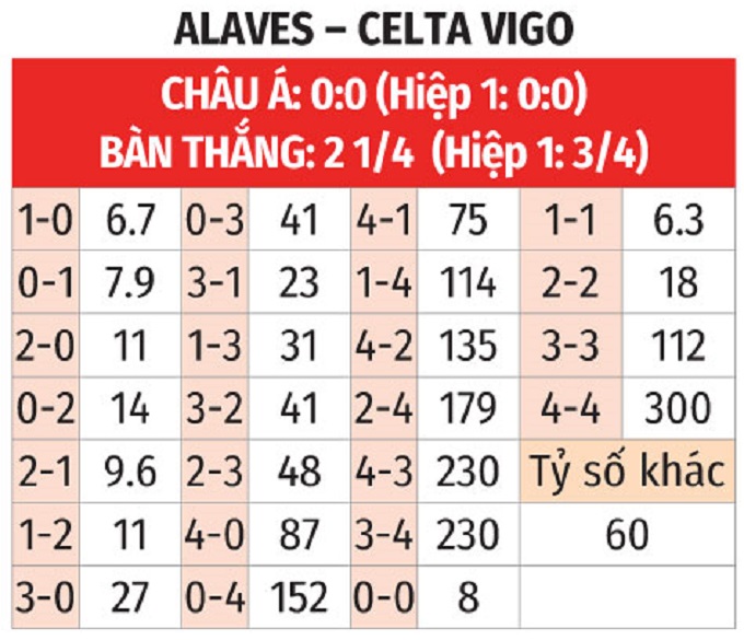 - Hiệp 1 có bàn thắng: 3 trận liên tiếp gần đây của Alaves đều xuất hiện bàn thắng trong hiệp đầu tiên. 9/10 trận vừa qua của Celta Vigo cũng có bàn thắng trong hiệp 1, với 6 trận có từ 2 bàn trở lên. Chưa kể, 8/9 trận đối đầu gần nhất bàn thắng cũng đến trước giờ nghỉ.