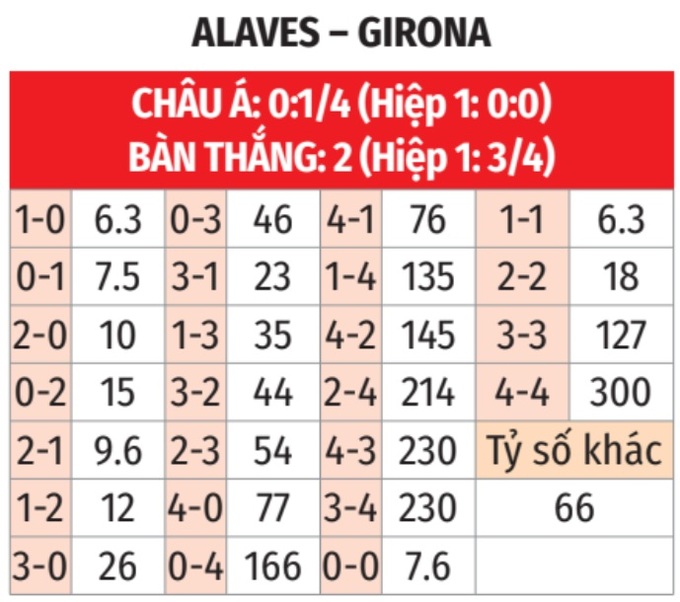 - Lẻ bàn thắng: 6/7 lần gặp giữa 2 đội gần đây kết thúc với tổng số bàn thắng là số lẻ. Tình trạng tương tự xảy ra ở 4/6 trận gần đây của Alaves và 8/11 trận vừa qua của Girona.