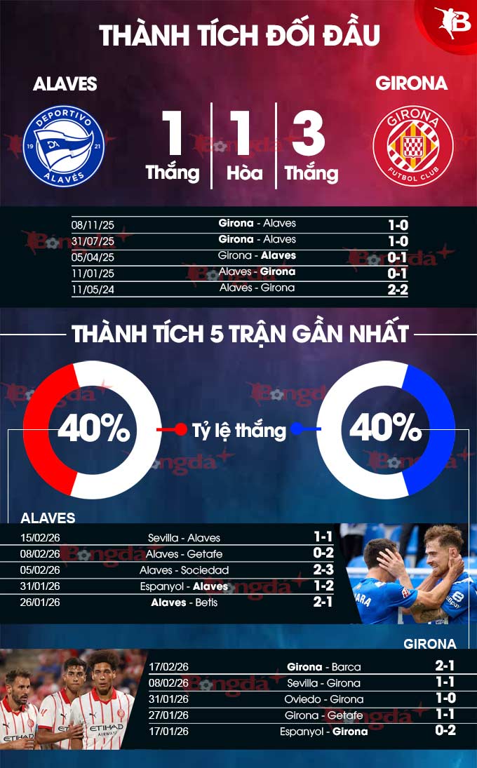 Girona cũng không hề yếu bóng vía trên sân khách. Trong 5 chuyến hành quân trở lại đây, họ chỉ phải nhận 1 thất bại, còn lại hòa 1 và giành 3 chiến thắng. Điều này sẽ giúp họ thêm tự tin khi hành quân đến sân của Alaves.