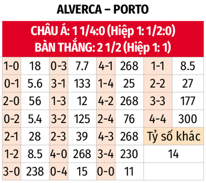 - Tối đa 1 bàn hiệp 1: Hàng thủ Porto giữ sạch lưới 9/11 trận gần đây trong hiệp đầu tiên. 5 trận vừa qua của Alverca chỉ xuất hiện 1 bàn thắng trước khi bước vào giờ nghỉ.