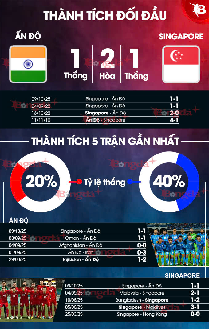 - Singapore thắng theo châu Á: 2 trong 5 trận gần đây, Ấn Độ thua châu Á. 3 trong 5 trận gần nhất, Singapore thắng châu Á. Tính cả 5 trận gần đây, Singapore không thua châu Á lần nào. Với việc chuyên gia đánh giá đôi bên cân bằng về năng lực, việc Singapore có thể tìm kiếm 1 chiến thắng với cách biệt 1 bàn, qua đó thắng châu Á là điều có thể xảy ra.
