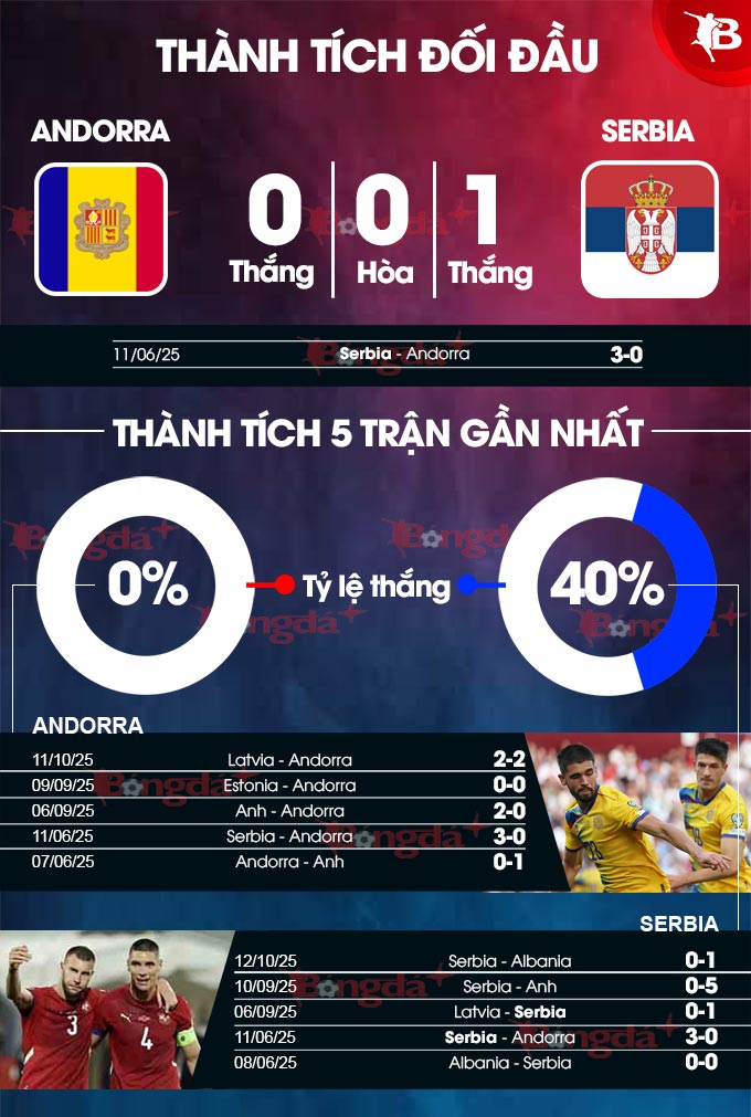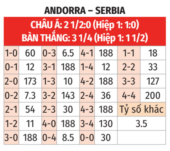 - Tối đa 3 bàn: 7/9 trận gần nhất của Andorra có tối đa 3 bàn. 8/9 trận gần đây của Serbia số bàn thắng cũng đều dưới 4.