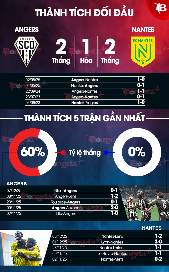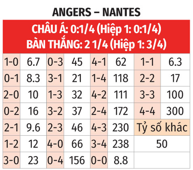 Chưa hết, Angers bất bại trước Nantes ở 3 trận đối đầu trực tiếp vừa qua (thắng 2, hòa 1). Bên cạnh đó, Angers cũng đang có tâm lý và tinh thần tốt hơn đối thủ. Nhiều khả năng, Angers sẽ giữ lại được 3 điểm trên sân nhà.