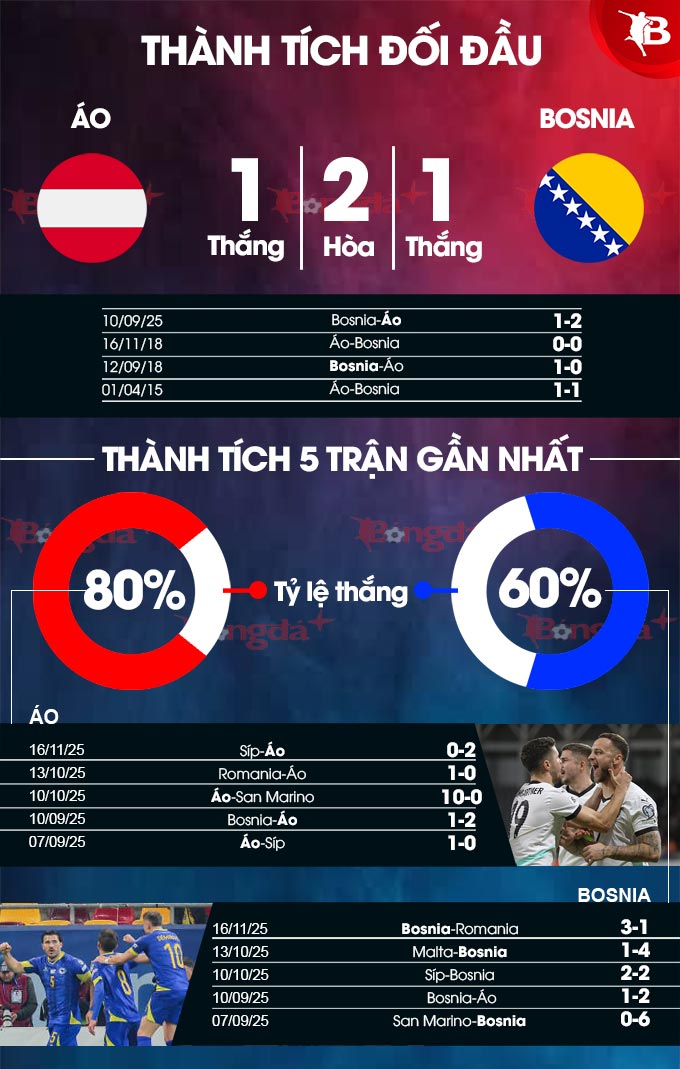 - 2 đội đều ghi bàn: Áo ghi bàn ở 6/7 trận đấu gần đây. Bosnia cũng nổ súng ở 8 trận liên tiếp vừa qua.