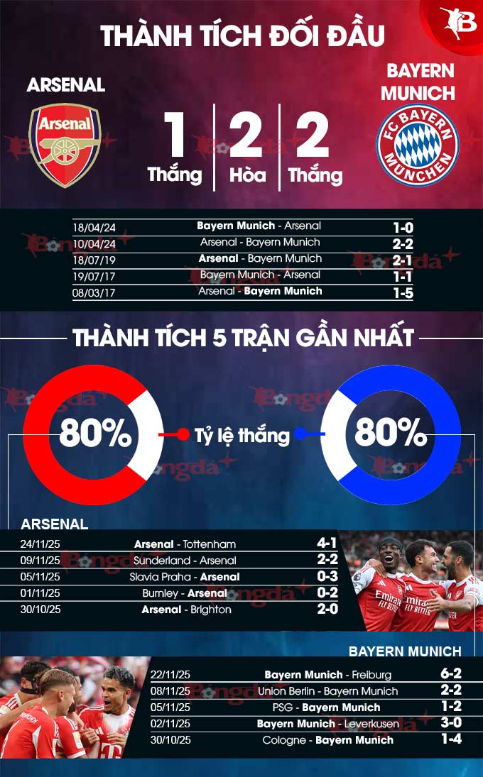 Nên nhớ rằng, trong 5 lần gần đây chạm trán với Arsenal trong khuôn khổ Champions League, Bayern Munich áp đảo gần như tuyệt đối. Cụ thể, Hùm xám thắng 4 và hòa 1 trận, trong đó có 3 trận họ nã vào lưới của đội bóng thủ đô London 5 bàn. Sân Emirates cũng không phải là điểm đến đáng sợ đối với đội bóng giàu truyền thống nhất nước Đức. Bằng chứng là trong 5 lần gần nhất đến thi đấu tại London, Bayern Munich thắng 3, hòa 1, chỉ phải nhận 1 thất bại.
