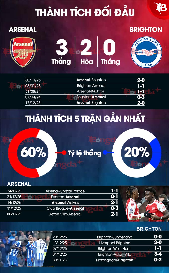 Ở 5 cuộc đối đầu gần nhất với Brighton, Arsenal đều bất bại, trong đó có 3 chiến thắng và 2 trận hòa. Điều này củng cố thêm niềm tin chiến thắng cho Pháo thủ trước một Chim mòng biển đang chao đảo với chuỗi 4 trận không thắng (2 hòa, 2 bại) và lối chơi thiếu hiệu quả. Phong độ thiếu ổn định, những vấn đề trong phòng ngự gần đây và hàng công không hiệu quả của Brighton khiến họ lép vế so với chủ nhà Arsenal ở cuộc đối đầu này.