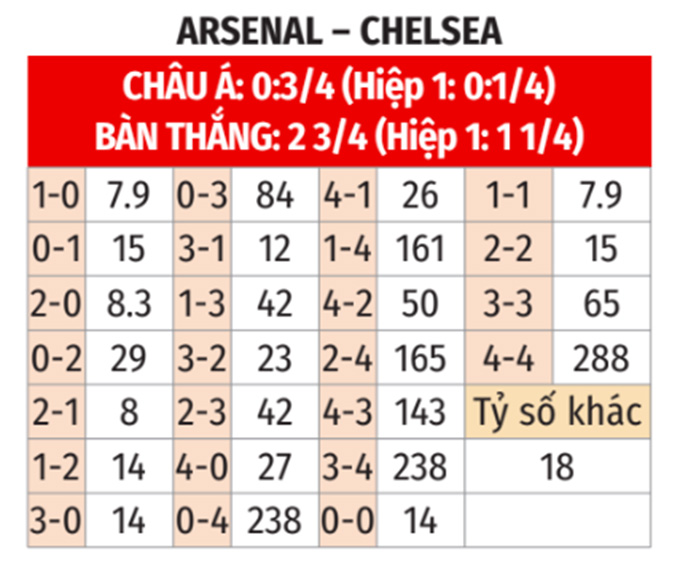 - Từ 3 bàn trở lên: 6/8 cuộc đối đầu gần nhất tại sân Emirates, 6/7 trận gần đây của Arsenal và 6/8 trận vừa qua của Chelsea đều có ít nhất 3 lần lưới rung cả trận. Không những thế, 7/10 trận gần đây của Arsenal và 7/8 trận vừa qua của Chelsea cũng khép lại với tối thiểu 3 bàn thắng cả trận.