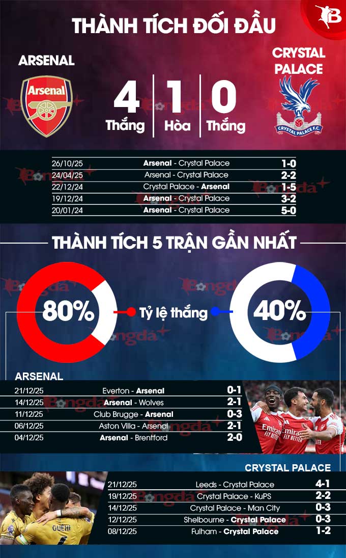 Về phần mình, không chỉ đối đầu lép vế, lực lượng tan hoang vì chấn thương và AFCON 2025, Crystal Palace còn có phong độ đáng báo động. Họ thua 2, hòa 1 ở 3 trận gần nhất và nhiều khả năng chuỗi không thắng sẽ nối dài lên 4 trận sau chuyến làm khách tại Emirates lần này.
