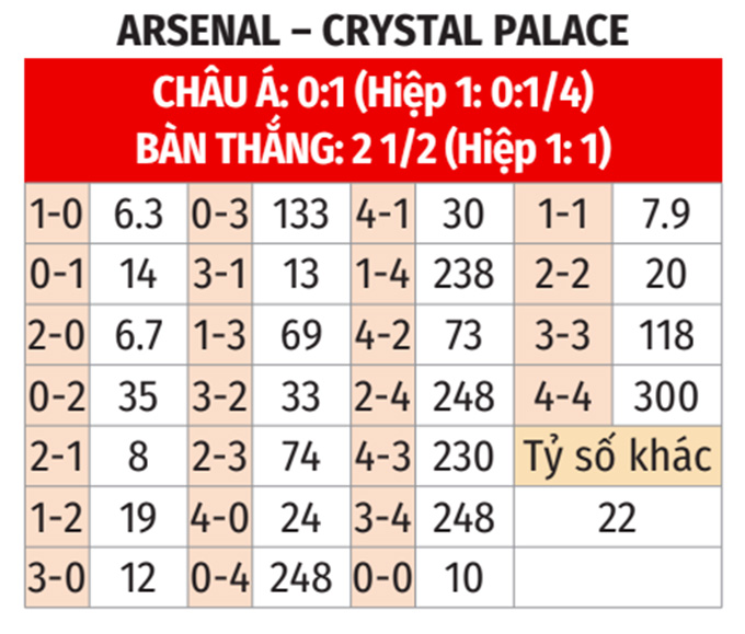 - Lẻ bàn thắng: 5/7 cuộc đối đầu gần nhất, 4 trận vừa qua của Arsenal và 7/8 trận gần đây của Palace đều có tổng bàn thắng là lẻ. Ngoài ra, 4/5 cuộc đụng độ gần đây tại Emirates và 9/10 chuyến làm khách vừa qua của Crystal Palace đều khép lại với tổng bàn thắng không chia hết cho 2.