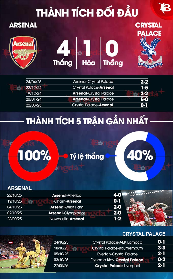 Nếu tính trong quãng thời gian gần đây, thì Arsenal đã thắng 5/6 lần đối đầu Crystal Palace vừa qua tại Ngoại hạng Anh, còn lại là trận hòa gần nhất với tỷ số 2-2 tại Emirates mùa trước. Một yếu tố lịch sử khác cũng ủng hộ Pháo thủ. Đó là, Arsenal chỉ thua 2 trong số 70 trận sân nhà tại Premier League khi họ bắt đầu ngày thi đấu với vị trí dẫn đầu bảng (thắng 52, hòa 16).