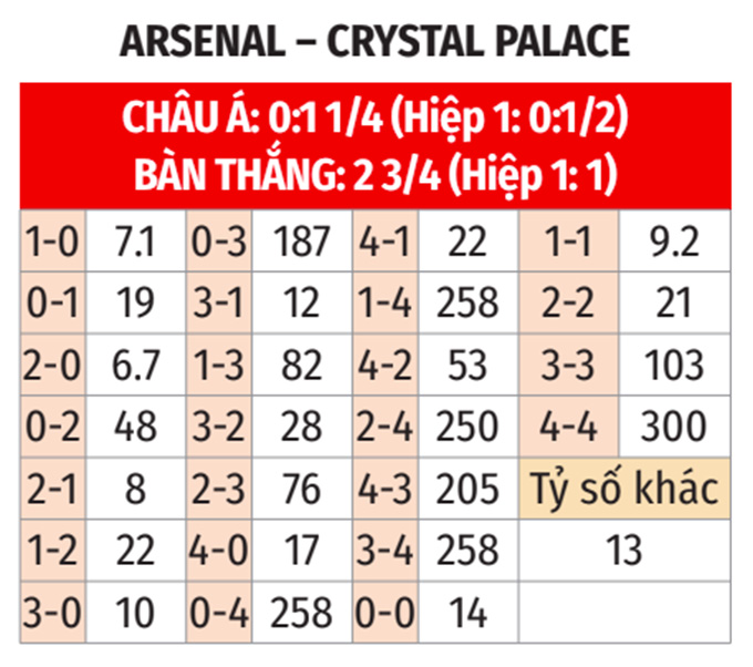 - Từ 3 bàn trở lên: 8/10 cuộc đối đầu gần nhất chứng kiến tối thiểu 3 bàn lưới rung cả trận. Hơn nữa, 8/9 lần chạm trán vừa qua tại Emirates cũng có ít nhất 3 bàn cả trận. Ngoài ra, 5/8 trận sân nhà gần đây của Arsenal và 4/6 trận gần nhất của Crystal Palace cũng đều có tối thiểu 3 bàn thắng sau 90 phút.