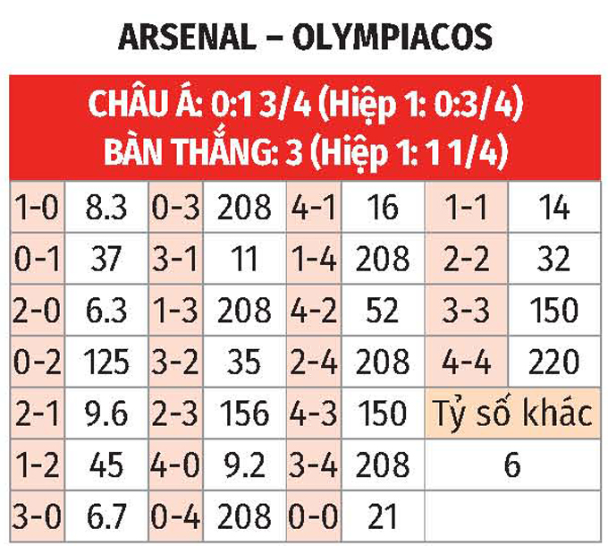 - Lẻ bàn thắng: 7/10 trận gần nhất so T giữa 2 CLB có tổng bàn thắng không chia hết cho 2. Ngoài ra, 7/10 trận vừa qua Arsenal và 2 trận mới nhất của Olympiakos đều chứng kiến điều tương tự.