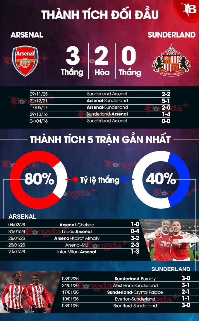 Sunderland chưa từng thắng trong 16 trận sân khách tại Premier League trước Arsenal (5 hòa, 11 thua). Hiện tại, Mèo đen cũng đang sở hữu chuỗi xa nhà rất tệ hại. Họ chưa thắng trận nào trong 7 trận sân khách gần nhất tại Premier League (3 hòa, 4 thua) kể từ chiến thắng 2-1 trước Chelsea hồi tháng 10/2025.