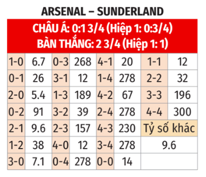 - Từ 3 bàn trở lên: 5/7 cuộc đối đầu gần nhất, 6/8 trận gần đây của Arsenal và 4/5 trận vừa qua của Sunderland đều có tối thiểu 3 lần lưới rung cả trận. Hơn nữa, 5/8 trận sân nhà gần đây của Arsenal cũng chứng kiến ít nhất 3 lần lưới rung cả trận.