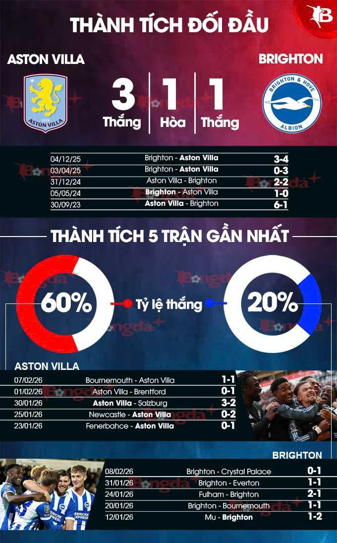 Tuy nhiên, trước trận đấu này, Aston Villa có nhiều lợi thế để giành trọn 3 điểm. Đầu tiên, họ đã thắng 7 trong 9 trận gần nhất tại Ngoại hạng Anh gặp Brighton (1 hòa, 1 thua) và đang hướng tới chiến thắng kép (thắng cả lượt đi và về) trước đối thủ này lần thứ 3 sau các mùa giải 2022/23 và 2023/24.