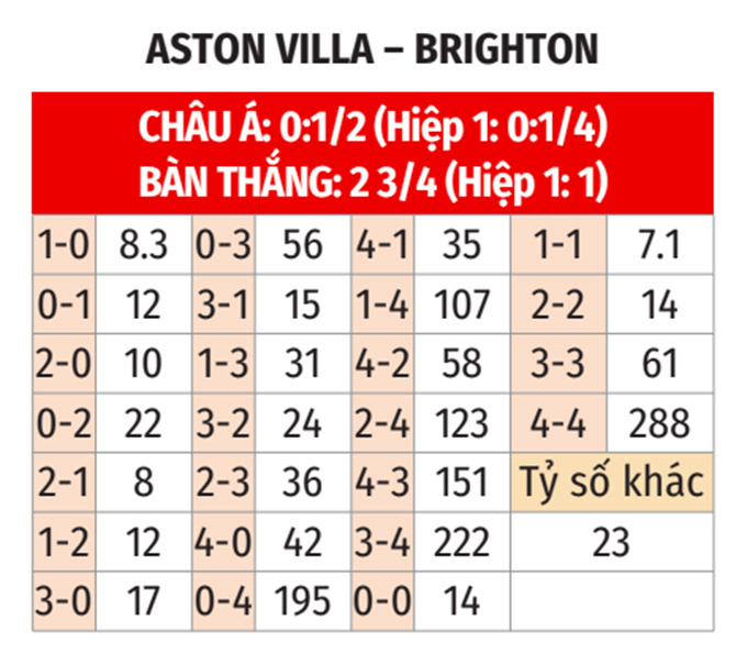 - Lẻ bàn thắng: 6/8 cuộc đối đầu giữa hai đội, 5/7 trận vừa qua của Aston Villa và cả 2 trận vừa qua trên sân khách của Brighton đều có tổng bàn thắng là lẻ. Đặc biệt, 7/8 trận sân nhà vừa qua của Aston Villa cũng đều có tổng bàn thắng không chia hết cho 2.