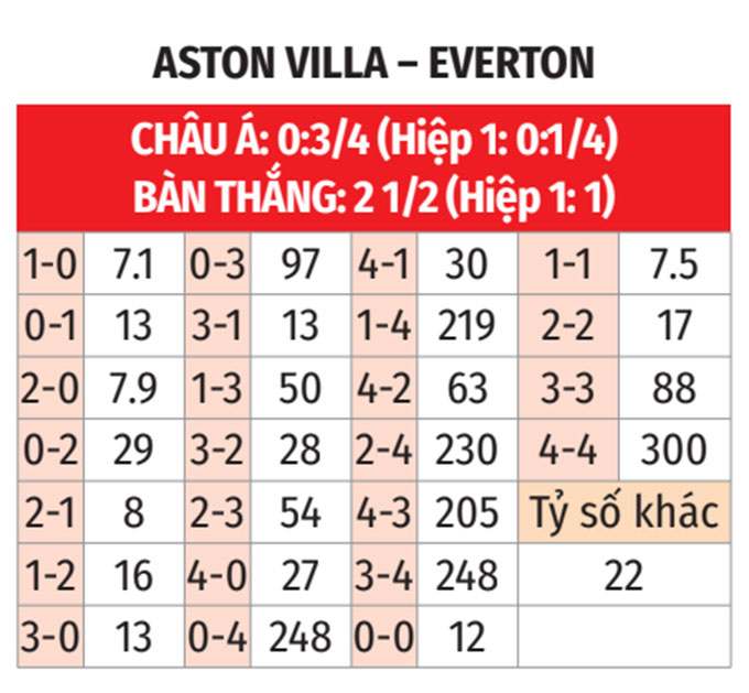 - Aston Villa thắng hiệp 1 theo châu Á: Trong 4 trận đấu gần đây, Aston Villa thắng hiệp 1 theo châu Á tới 3 lần. Thực tế trên cộng với việc Everton thua hiệp 1 theo châu Á 5/7 trận vừa qua là lý do các nhà đầu tư nên ủng hộ đội chủ nhà trước giờ nghỉ.