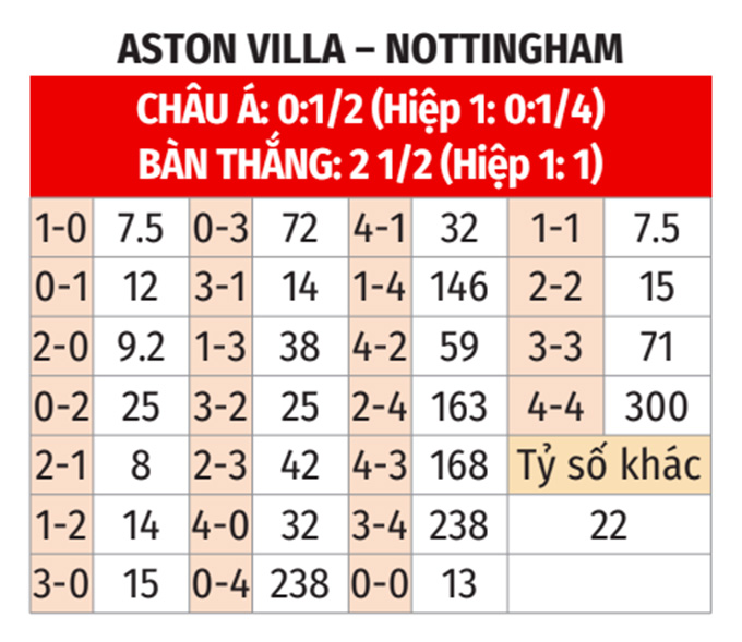 Nottingham hoàn toàn có khả năng tạo nên bất ngờ khi thi đấu trên sân khách, như chiến thắng 3-0 trước Liverpool ngày 22/11 vừa qua. Vì thế, rất có thể thày trò HLV Dyche sẽ giành được ít nhất 1 điểm từ Villa Park.