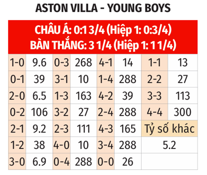 Rõ ràng Aston Villa được đánh giá cao hơn Young Boys ở cuộc đối đầu này. Với phong độ cao, sở hữu dàn cầu thủ chất lượng và cùng kinh nghiệm dẫn dắt của Unai Emery, nhiều khả năng Aston Villa sẽ giành chiến thắng để tiến gần hơn 1 suất vào thẳng vòng 16 đội.