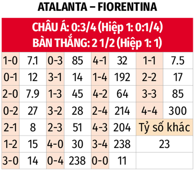 - Lẻ bàn thắng: 4/5 trận vừa qua của Atalanta cùng 7/9 trận vừa qua của Fiorentina đều có tổng bàn thắng là lẻ. Kịch bản lẻ bàn thắng cũng diễn ra ở 6 trận đối đầu gần nhất giữa hai đội.