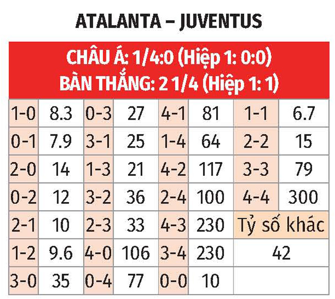 Lẻ bàn thắng: 6/10 trận đấu sân nhà gần đây của Atalanta có tổng bàn thắng không chia hết cho 2. Điều tương tự cũng đến ở 7/10 trận sân khách mới đây của Juventus.
