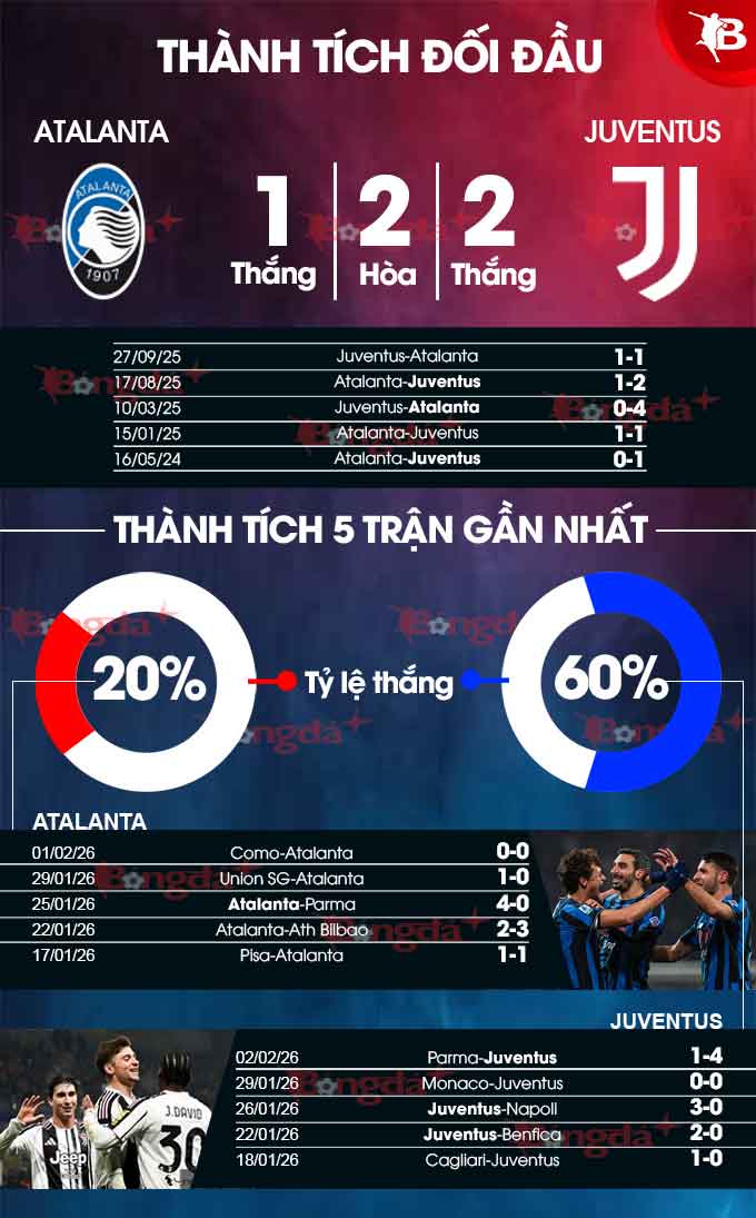 Về đối đầu, Juventus vượt trội so với Atalanta trong thời gian gần đây, với 3 chiến thắng, 6 trận hòa và 1 trận thua trong 10 lần đối đầu gần nhất. Trên sân của Atalanta, Juventus đã bất bại 6 trận liền, thắng 3 trong số đó. Xem ra, Juventus sẽ lại khiến đối thủ phải cay đắng ngay trên sân nhà.