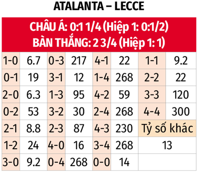 - Atalanta thắng chấp góc hiệp 1: Các cầu thủ Atalanta tích cực "cày góc" sớm, khi thắng kèo chấp góc hiệp đầu ở 4 trận liên tiếp gần đây. Với Lecce, đội khách thua kèo góc 2/3 trận vừa qua trong 45 phút đầu. Ngoài ra, trận đối đầu gần nhất trên sân nhà cũng chứng kiến Atalanta đánh bại Lecce 5-2 về chỉ số góc trước khi bước vào giờ nghỉ.