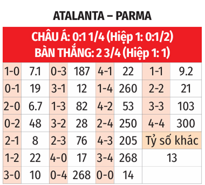 - Lẻ bàn thắng: 7/10 trận so T gần nhất giữa 2 CLB có tổng bàn thắng không chia hết cho 2. Ngoài ra, 6/10 trận sân nhà vừa qua của Atalanta cùng 5/7 trận mới nhất của Parma kết thúc với kết quả tương tự.