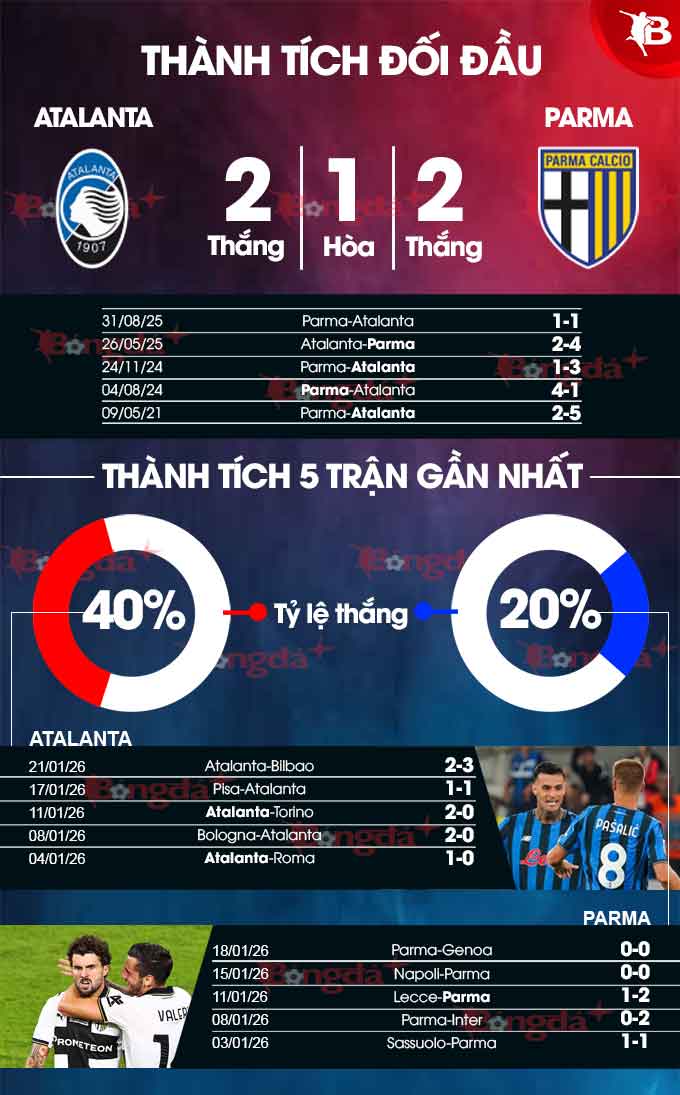 Atalanta có lợi thế sân nhà và đang chơi khá ổn ở thời gian này khi thắng 6/8 trận vừa xong, còn Parma thắng 3/10 trận sân khách đã qua.