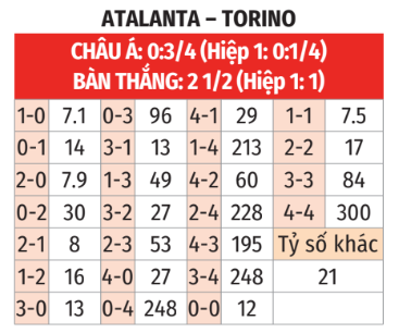 - Torino thắng theo châu Á: Torino thắng theo châu Á cả 5 trận sân khách gần đây ở Serie A khi là đội chiếu dưới. Trong 9 trận Serie A và Champions League vừa qua khi nhường đối phương 1/2 bàn trở lên, Atalanta thua theo châu Á tới 7 lần. Tuy đang có phong độ tốt nhưng thực tế đó là bởi Atalanta được gặp những đội có thực lực mạnh (Bologna và Roma), chống lại đối thủ yếu không phải sở trường của Atalanta. Torino sẽ có điểm và thắng theo châu Á. Ngoài ra, trong 5 lần chạm trán gần nhất ở Bergamo khi Atalanta nhường Torino 3/4 bàn trở lên, Torino thắng theo châu Á… 100%.