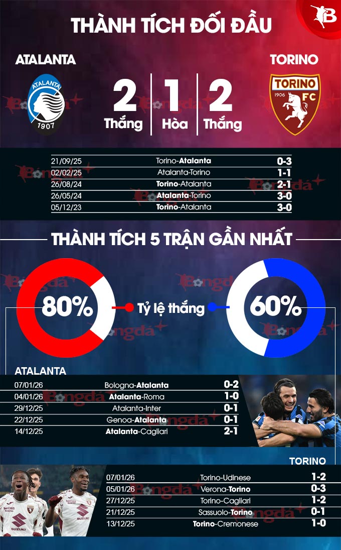 Trong 7 lần gần nhất tiếp đón Torino trên sân nhà, Atalanta chỉ thắng được đúng 2 trận, trong đó có trận thắng 3-0 vào cuối mùa 2023/24 khi mùa giải đã sắp khép lại. Torino đủ khả năng khiến Atalanta phải chịu một cú vấp.