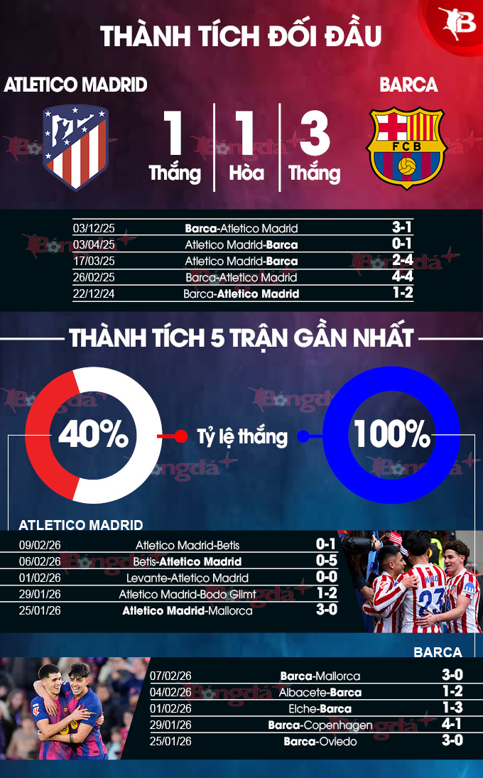 Xét về đối đầu, Barca đang áp đảo Atletico. Cụ thể, ở 10 cuộc đối đầu gần nhất, Barca thắng tới 8, hai đội hòa nhau 1 lần, còn Atletico giành 1 chiến thắng. Trên sân nhà, đội bóng của HLV Diego Simeone thắng 2, thua 4 ở 6 trận vừa qua.